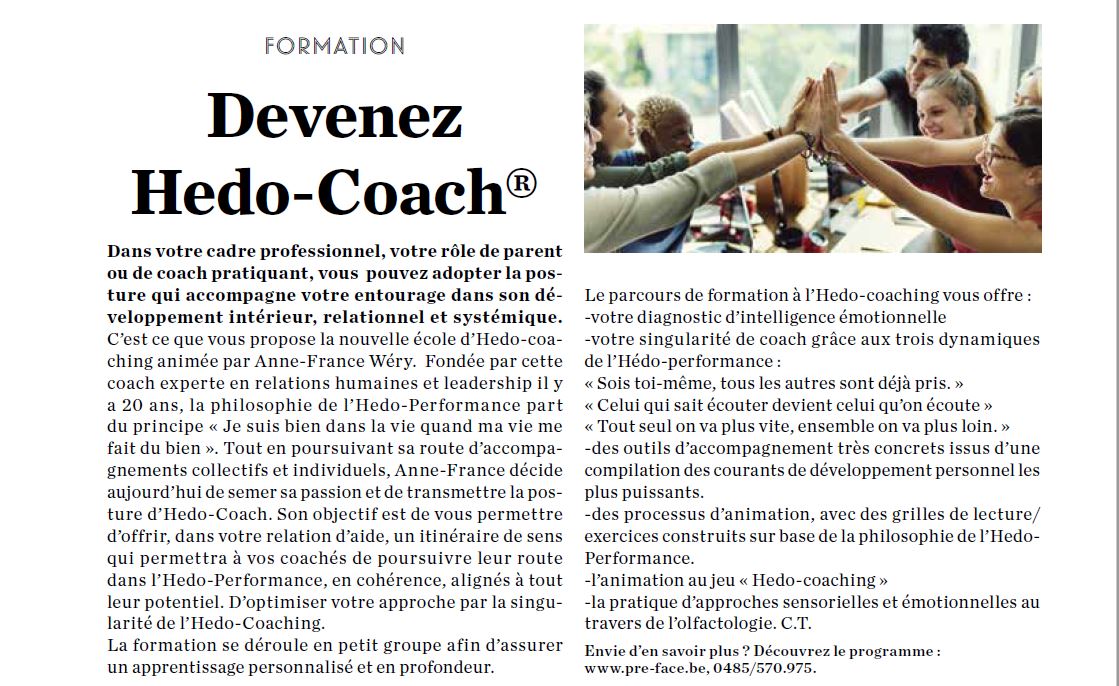 Vu le succès rencontré lors du lancement de l’Ecole d’Hédo-Coach, un deuxième groupe débutera en octobre. La formation se déroule en petit groupe afin d’assurer un apprentissage personnalisé et en profondeur. Chaque participant reçoit un questionnaire de préparation, en amont du parcours. Le début de ce deuxième groupe est programmé les 12 et 13 octobre.